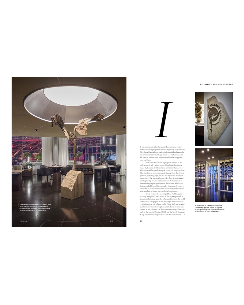 Az „Ikarus. Salzburg Welcomes the World” bookazine-sorozat ezeket a találkozásokat, valamint a közösen megalkotott recepteket dokumentálja. Az idei évben új, igazán különleges stílusban jelenik meg. A Red Bull Hangar-7 és a Restaurant Ikarus átfogó megújulásával összhangban a bookazine és a digitális „Ikarus Experience” teljes arculati és tartalmi megújításon esett át.