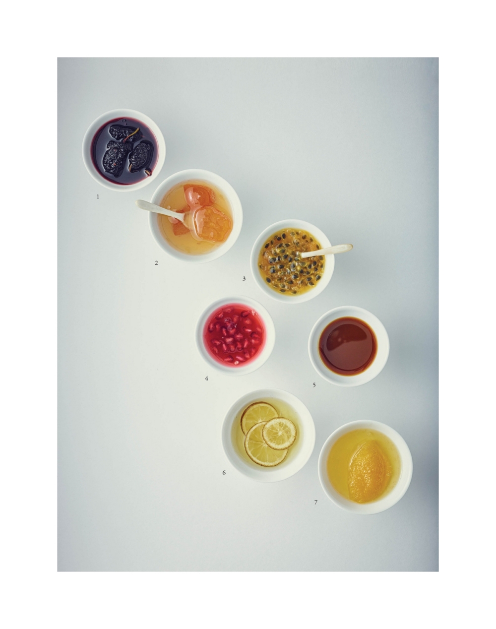 A receptgyűjteményt gazdagon illusztrált alfejezetek keretezik, amelyek az alapvető italokat, köreteket és fűszereket ismertetik. Ide tartoznak az alkoholos italok; a bugak (szárított, olajban ropogósra sütött zöldségek vagy algák); a jangajji (savanyúságok); a teák; valamint a gyümölcs- és zöldséglekvárok.