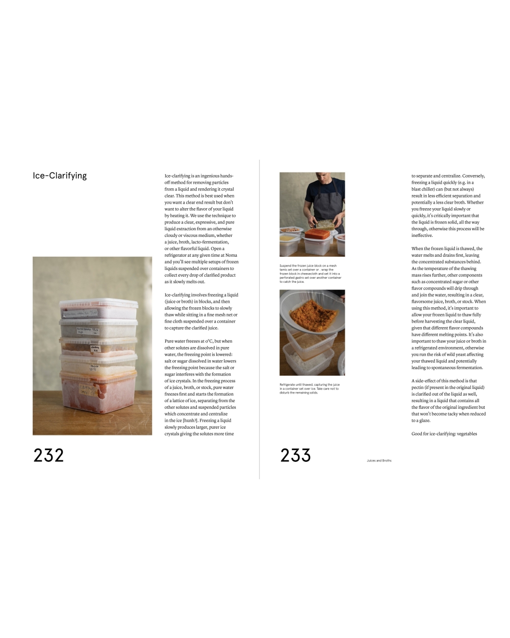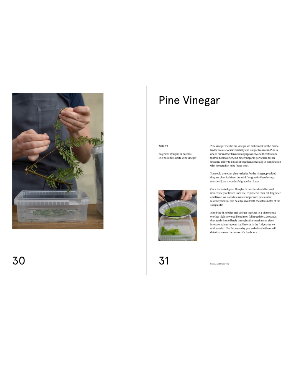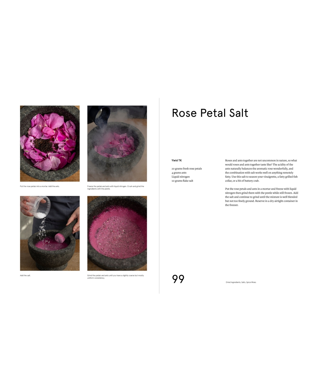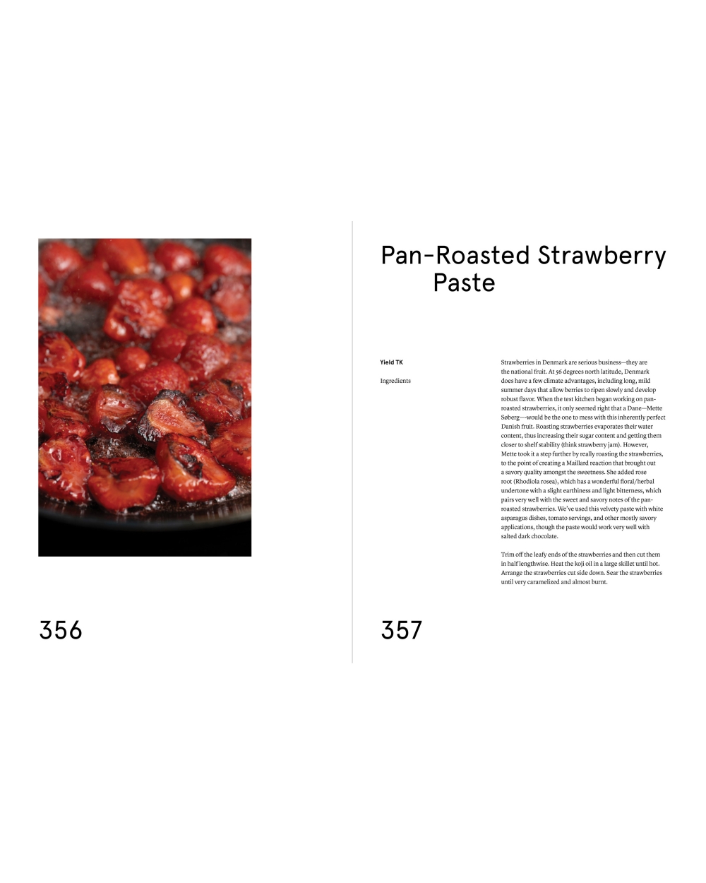 A receptek többsége lépésről lépésre készült fotósorozatokkal illusztrált, amelyek részletesen bemutatják azokat a technikákat, amelyek segítségével a meglepően ismerős alapanyagok a Noma egyedi konyhájának elemeivé alakíthatók. A Noma ezeket a recepteket az étterem számára kifinomult fogások elkészítéséhez használja (a könyvben válogatás látható a gyönyörűen tálalt ételek fotóiból is), de az olvasók — legyenek akár profik, akár lelkes otthoni szakácsok — rengeteg inspirációt találhatnak saját konyhájukhoz, kiegészítve a Noma séfjeinek megvalósítható javaslataival.